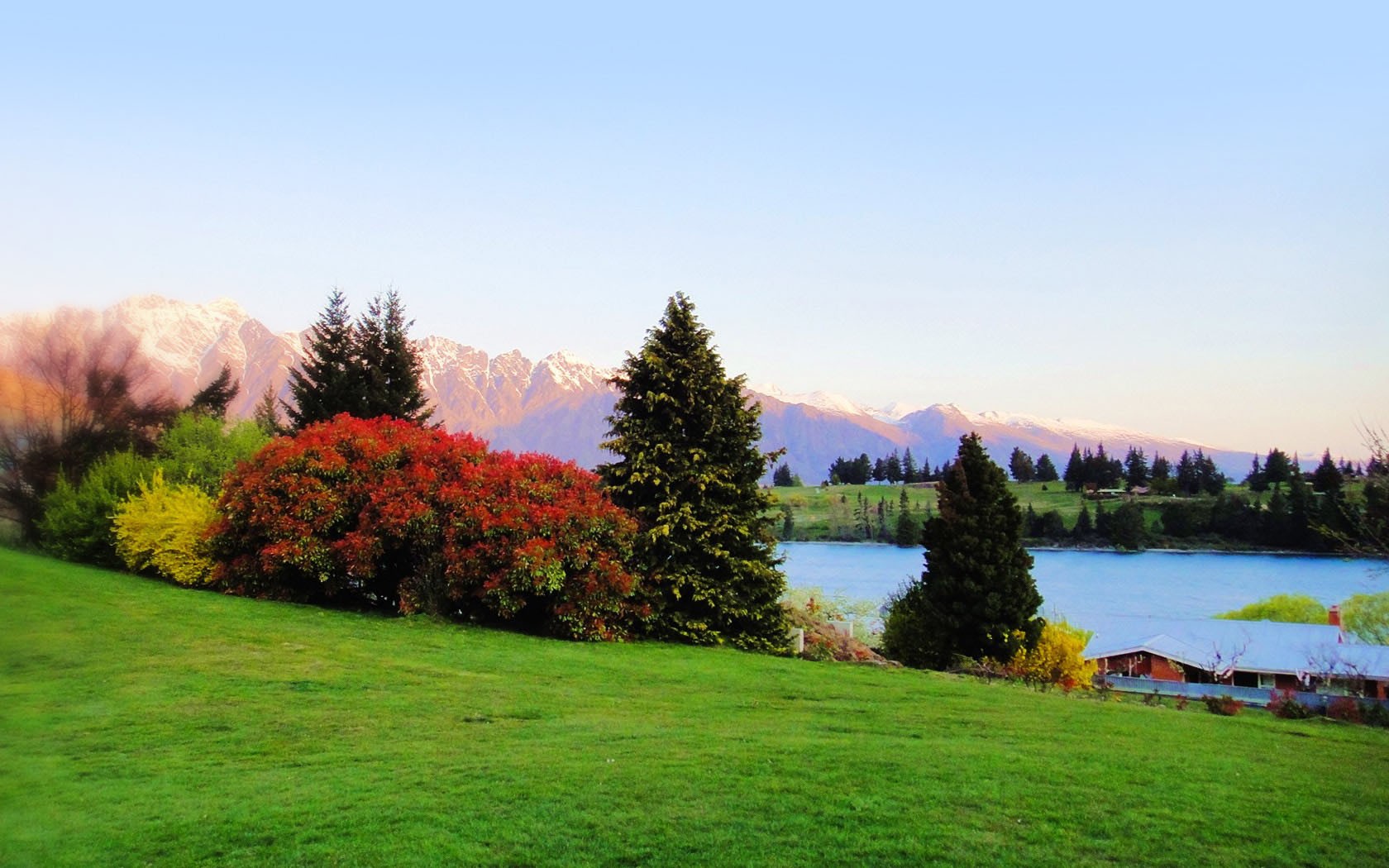 湖光山色映朝霞